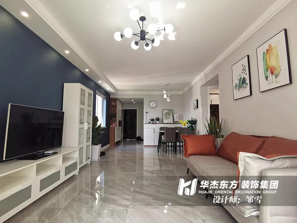 客厅墙面以大面积纯色铺开,经典的冷色系营造出干净明朗、清爽自然的氛围,电视背景墙采用纯色壁布且延伸至入户,将墙面的整体性无限延长。其他墙面采用色漆搭配,北欧极简感觉十足。 地面通铺近年流行的灰色调抛釉砖,空间延展的同时,***感油然而生。 家具则以简洁为主,不追求华丽造型,入户的右边设计了一个收纳区域,增加了收纳空间,更加方便实用。