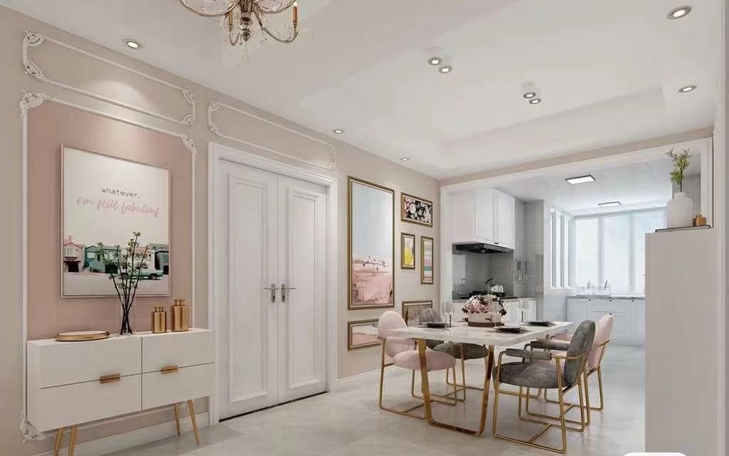 以裸粉色为背景,带有层次感的线条为饰面,使空间更具延展感