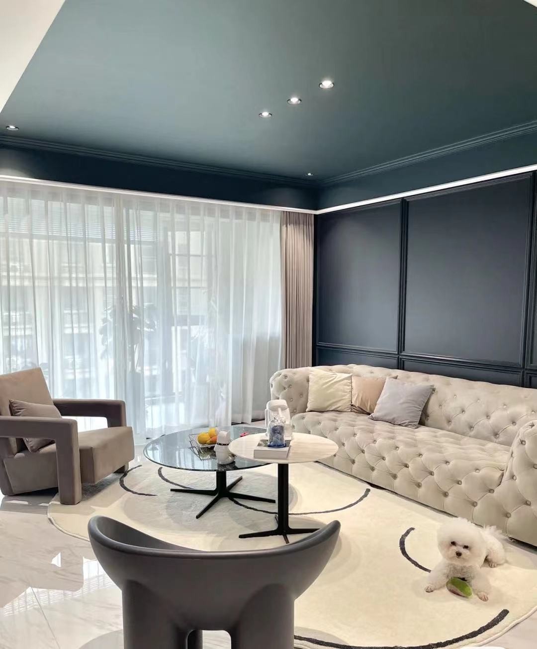 卧室背景墙是石膏线做的,刷黑漆,白色壁灯加以点缀