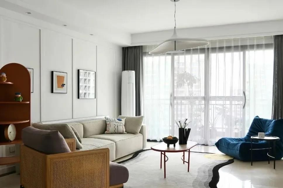 客厅,保留原有地面,顶面进行微改,无拘束的空间格局带来通透延展的视野