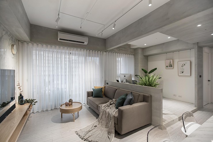 再往里走就是客厅,采光也还算不错。客厅墙面与其他空间用不同的颜色区分 ,配上浅灰色沙发,