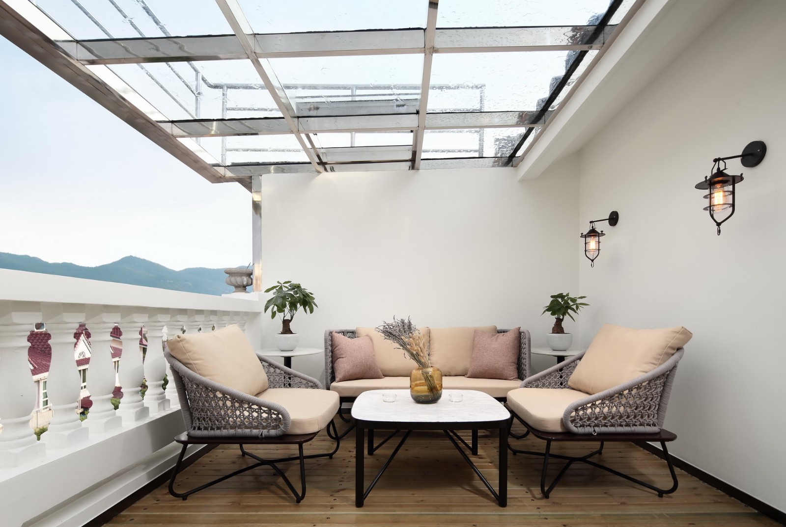 阳台地面铺上踏实的浅色木地板,只是留白的墙面,只是一组舒适的户外家具和三两棵盆景,与外面绝美的景色相比,这里的一切摆饰都是多余。