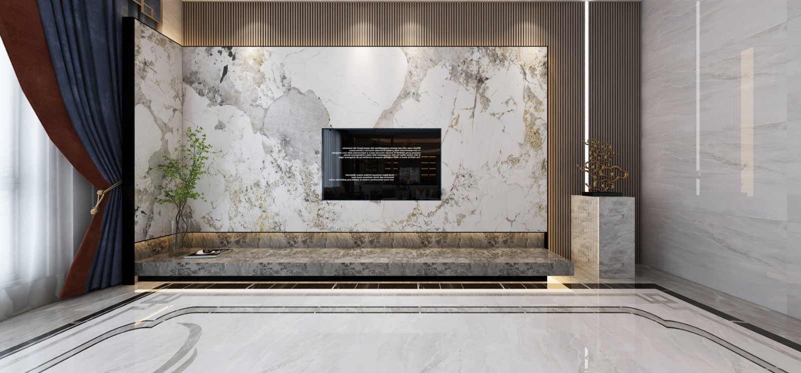 大理石在深灰色木栅格背景的推动下表示的它"老大”的地位!体现出主人的大气和格局。