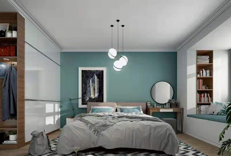 卧室的主调是白色,白色衣柜搭配飘窗,造就了空间的干净和利落,而绿色背景墙,无疑带来一丝清凉,