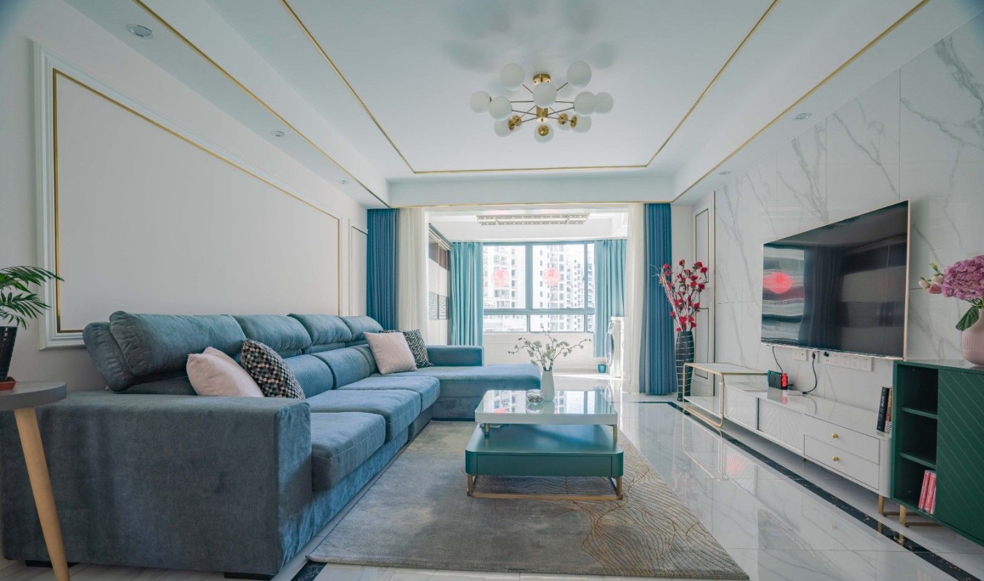 本案整体风格为现代轻奢风,设计师通过白色、蓝色和绿色的搭配,来打造这一个温馨而又舒适的家,整体既实用又好看