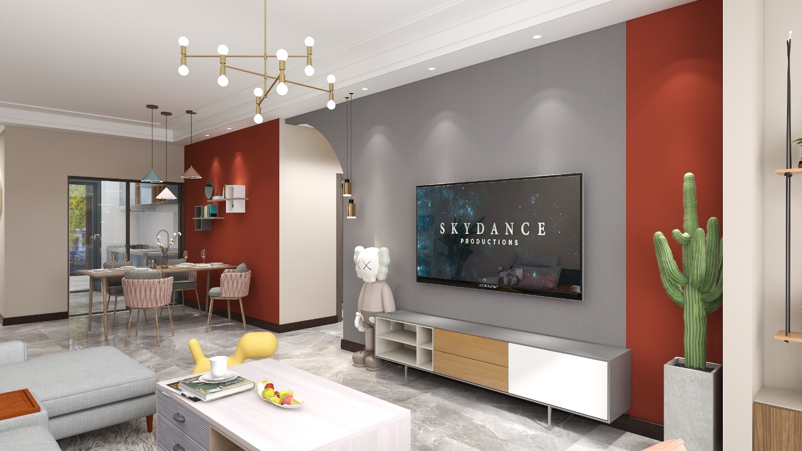 餐厅背景采用鲜艳红色乳胶漆做背景,和客厅背景形成称托,给人极强的视觉冲击感