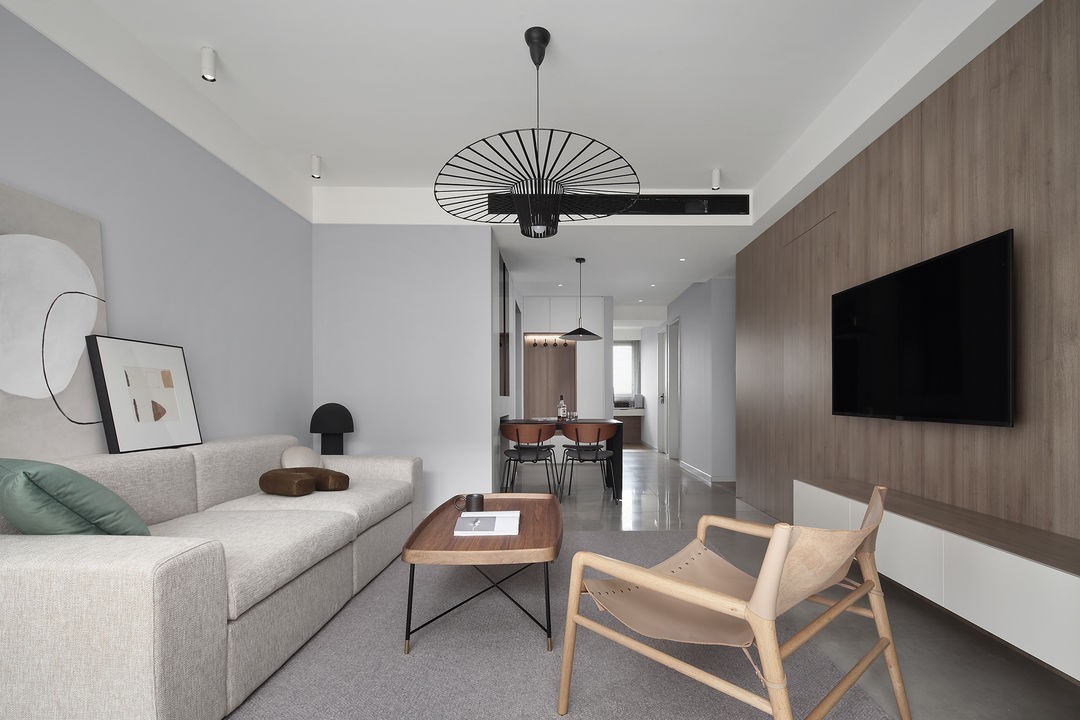 本案是90后业主的家,父母偶尔来一起居住,用低饱和度的灰色调与原木元素,诠释一个简约精致,富有现代气息的居住空间。弱化分界的概念,使各功能区动线流畅,设计师倾以巧思在略显局促的空间将调酒,冲泡咖啡,阅读等生活情趣全然安放,在厨房的设计中,空间不能一览无余,让人不禁想象空间的边界在哪里。