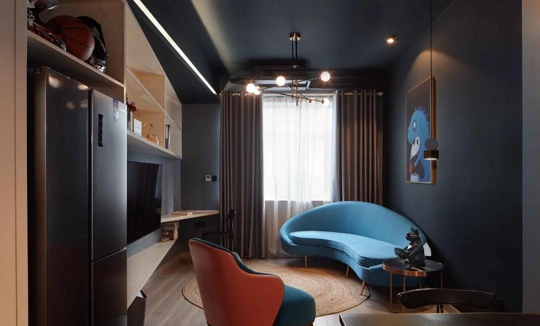 走进室内,迎面而来的就是浓浓的现代工业气息,整个客厅的墙面都是明度较低的深灰蓝色,神秘深邃,通过明亮的蓝色与温暖的橙色的提亮点缀,色彩的对比,让空间更有层次与深度。