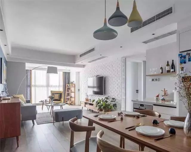 从餐厅看往客厅,电视背景墙做了整墙的文化砖造型,再加上原木风的电视柜和绿植作为点缀,让人感觉文艺而又清新。