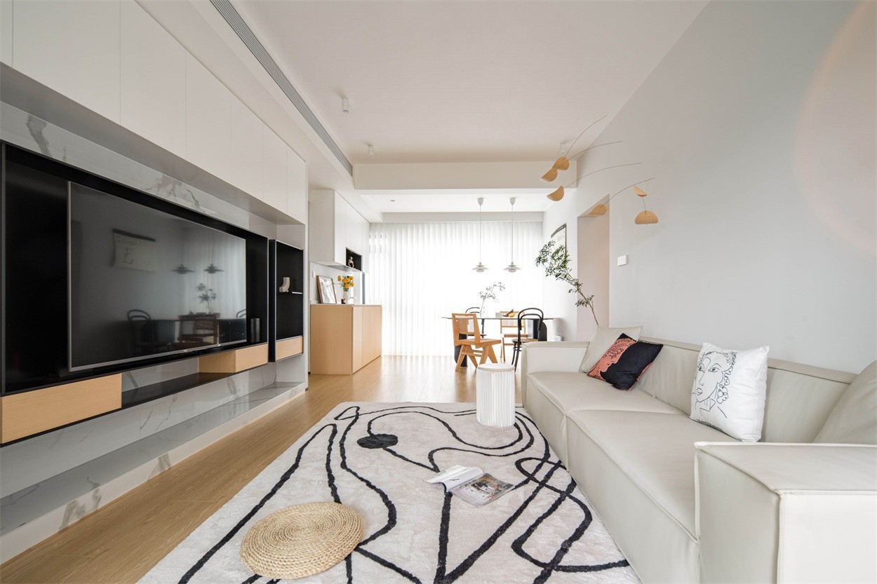 米白色窗帘是不同层次的“黄”。凹陷的电视柜无形中放大了客厅空间。底下镂空部分小朋友与小宠物应该会很钟意探索吧。
