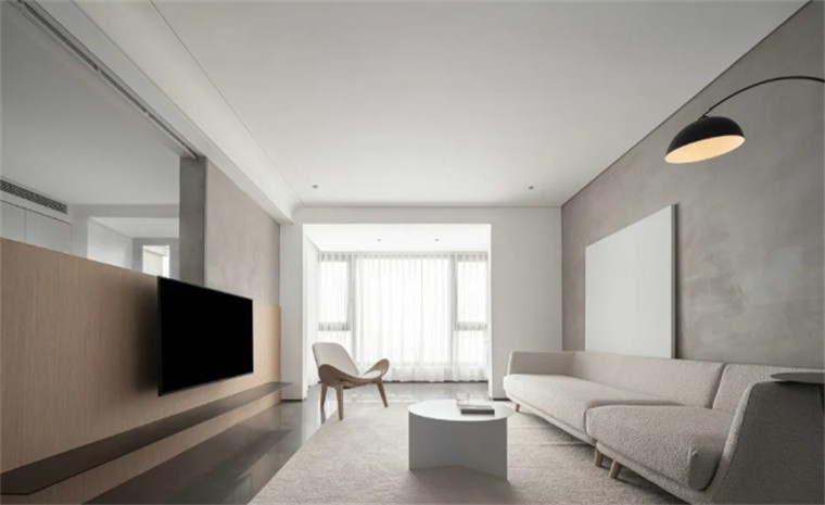整体色彩上应用石材的黑、顶部的白、微水泥的灰为基调,再通过木色做为媒介使整体色调情绪安静下来,让空间与屋主产生感性而又放松的氛围