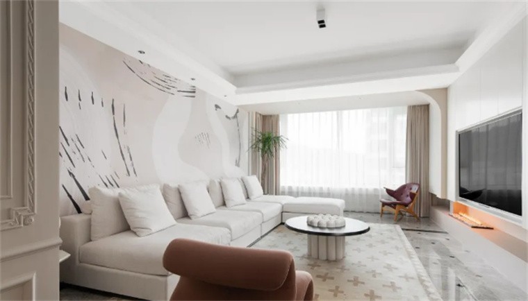 客厅保留原有地面,顶面无主灯设计,明亮的空间自然感十足,纳入阳台,辅以弧线垭口,刻画空间柔美视觉