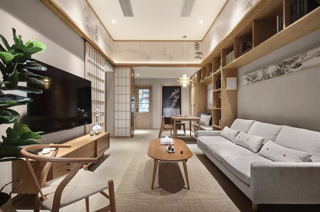 客厅电视墙面没有做强调,只是最基本的家具摆放。过道处放置可开合的日式移门,关上后起到一定的保温和装饰作用。