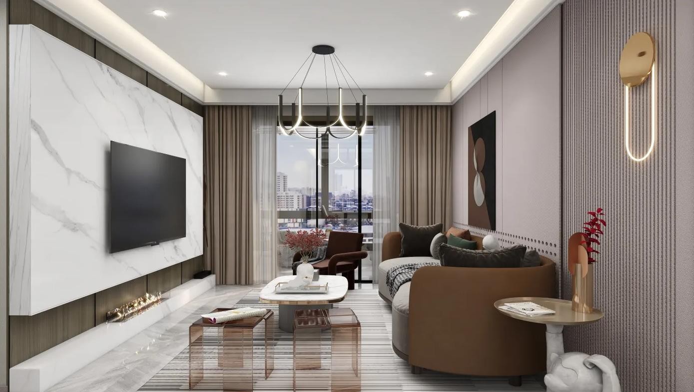 极具现代感的壁灯和艺术吊灯,深色沙发与白色大理石形成鲜明对比。