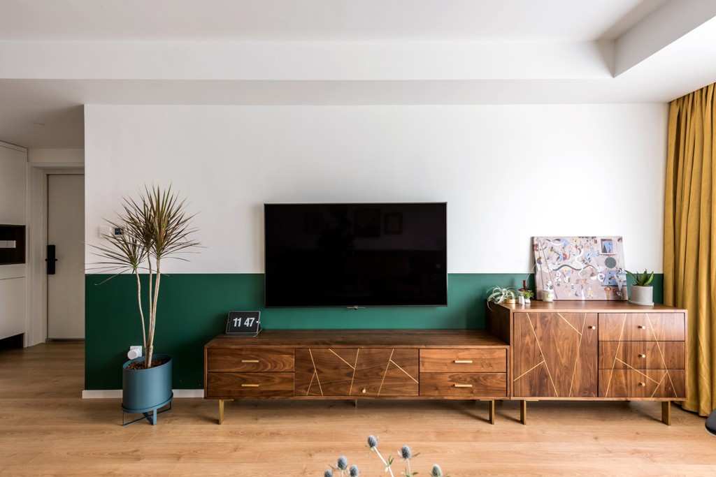电视柜以简约原木线条呼应撞色意象,使用绿白分色减轻柜体份量,思量走至阳台动线的流畅性,通体贯通.