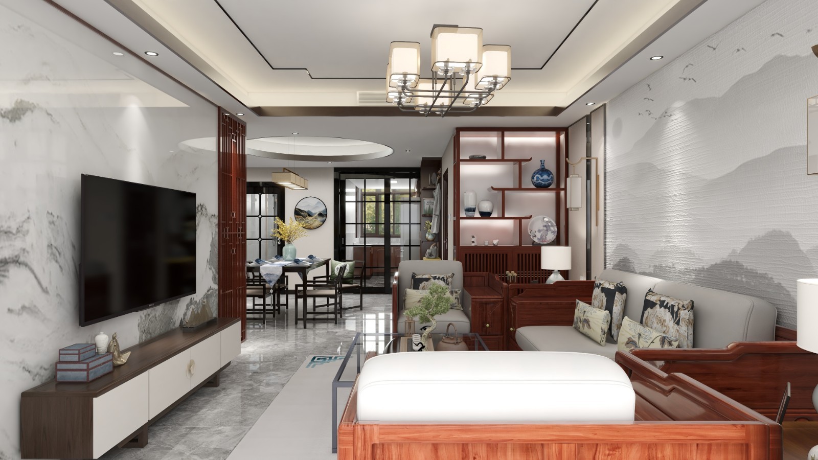 顶面方兴灯槽吊顶,业主喜欢红木家具,电视背景墙大理石彰显气质