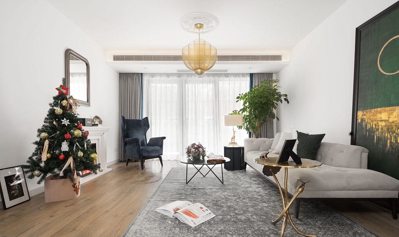 主告诉我他们之所以买这个在河边的带院子的一楼,是为了他家一条名字叫面包的黑色拉布拉多。他们追求生活的精致,热爱艺术。希望有一个明亮宽敞的空间,把自己喜欢的点滴融入其中,偶尔也能满足亲朋好友在一起聚会。沟通过后,我们在硬装的设计尽可能到保留大空间格局,去掉大块的装饰,只是用一个白色石材壁炉跟复古的石膏线灯盘点缀空间,希望更多的通过软装来呈现空间独特的个性。基于一个绿色的主色调,很多的摆件及画都是来自
