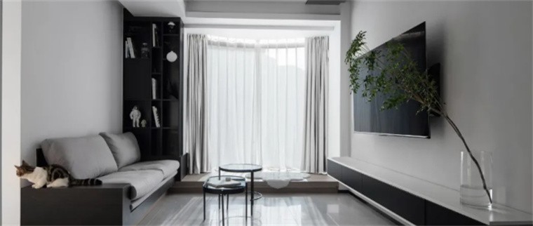 客厅纳入弧形阳台,设计地台与沙发连为一体,家具造型简洁轻巧,黑白灰配色呈现出干净利落的空间气质