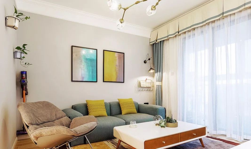 沙发墙上悬挂的两幅装饰画,色调与沙发、抱枕的颜色一致,整个空间配色更显和谐。