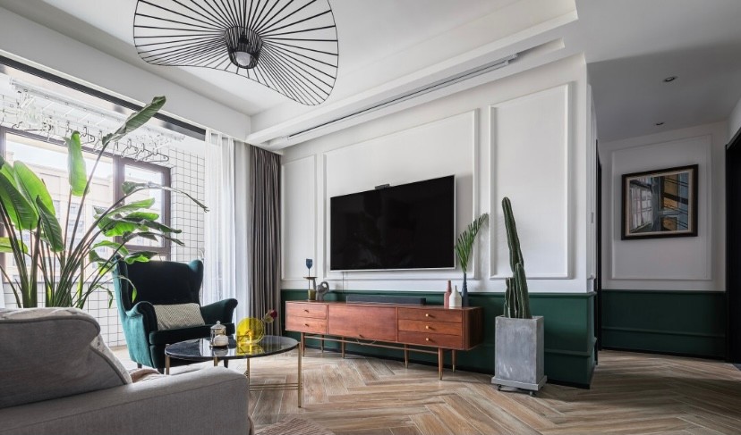客厅是被一圈白绿拼接的石膏线围绕的,后期不需要多余的软装饰品,硬装结束就已经很美了。瓷砖选的是复古纹理,能感受到家中明显的层次感和视觉舒适性。点睛之笔的草帽灯,能让人感觉到空间是在流动的。 整个客厅的颜色还是很多的,但是仔细看会发现,都是主色调的不断变化。