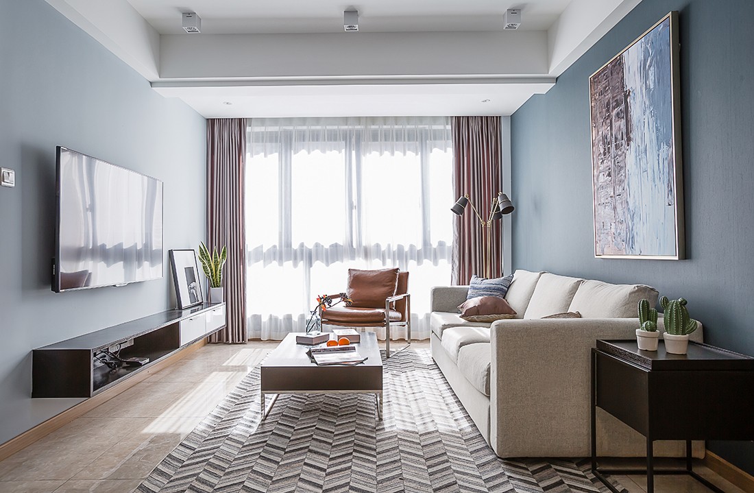 用玻璃隔断阳台和客厅,客厅的光线更加明亮,蓝色的背景墙和原木材质的搭配让空间显得更加温馨,用浅色系的布艺沙发也显得更为和谐。