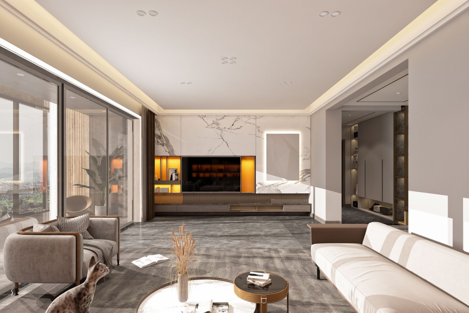 本案以现代轻奢为主,偏向于极简现代,客户对房子追求舒适为主,客厅的无主灯让客户对设计师加100分,客户特别喜欢简单但是有档次的东西,所以本案简单但不失档次。