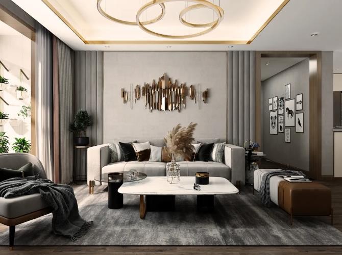 △ 客厅灰色系色调的搭配让空间氛围增加些高冷气息,浅灰色是沙发背景墙搭配立体造型金属质感装饰,深色实木地板,搭配灰色的地毯,既美观又舒适,尽享时尚与潮流。 大理石与金属搭配的茶几,造型简洁,另一侧墙上的装饰画,让整面墙更为生动,同时给客厅增添了艺术气息。