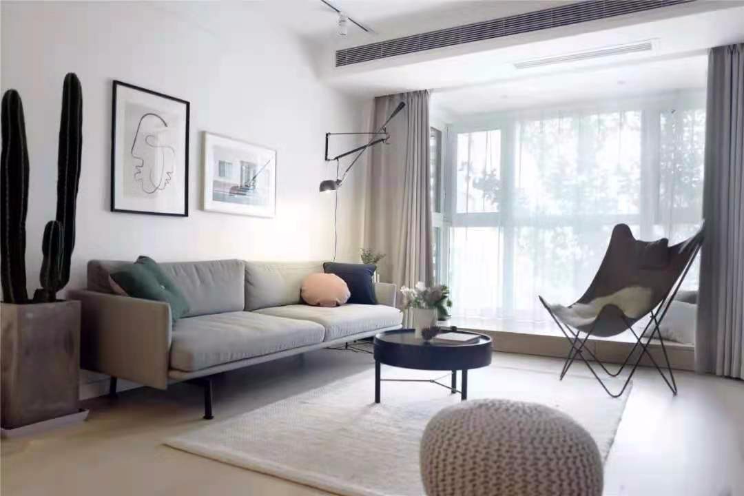 客厅的沙发墙选择了留白加上挂画的设计,浅灰色的布艺沙发和绿植,地毯给人一种舒适感,客厅外的阳台改成了一个地台,增添休闲性。