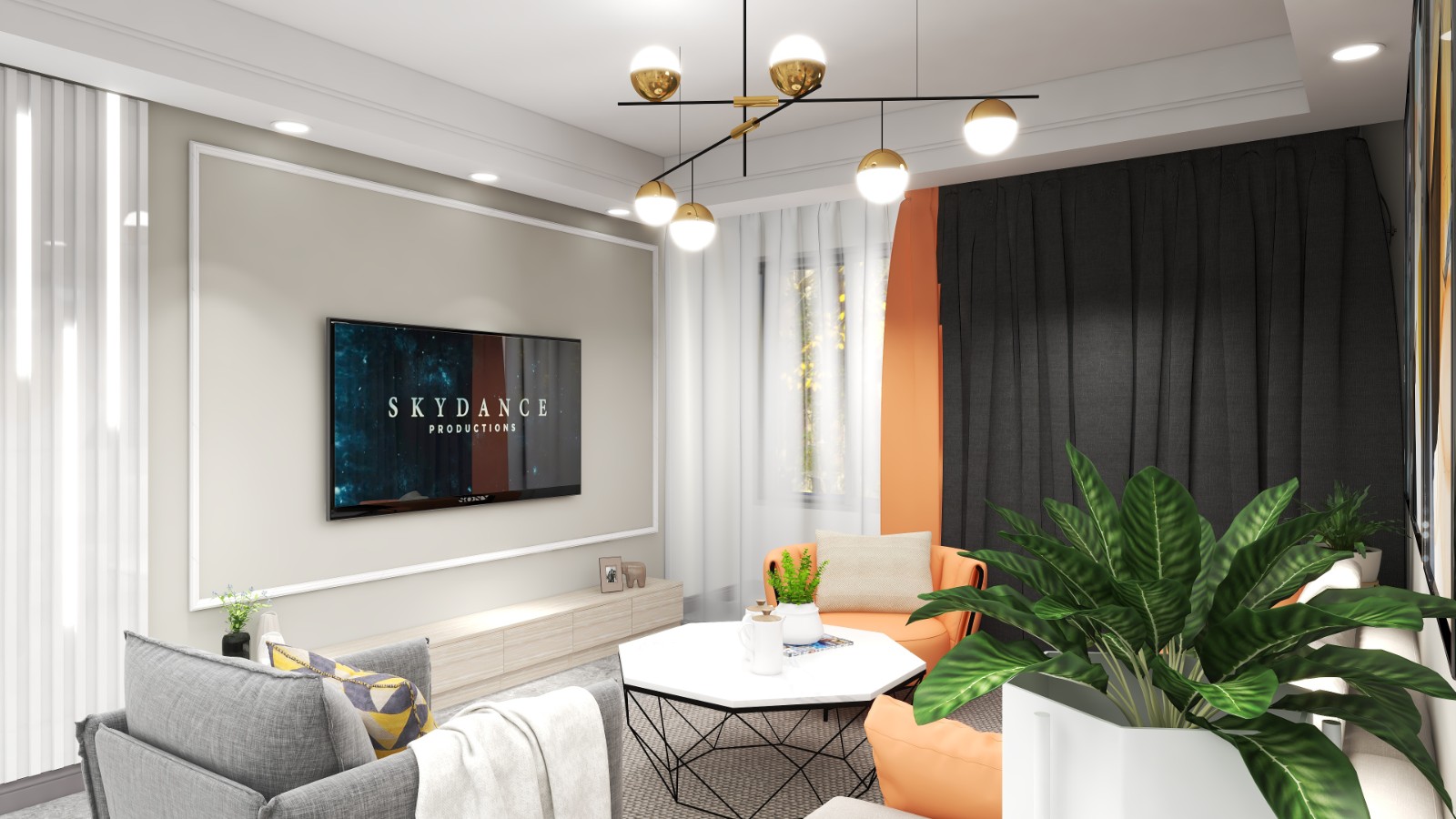撞色窗帘提亮了整个客厅的氛围