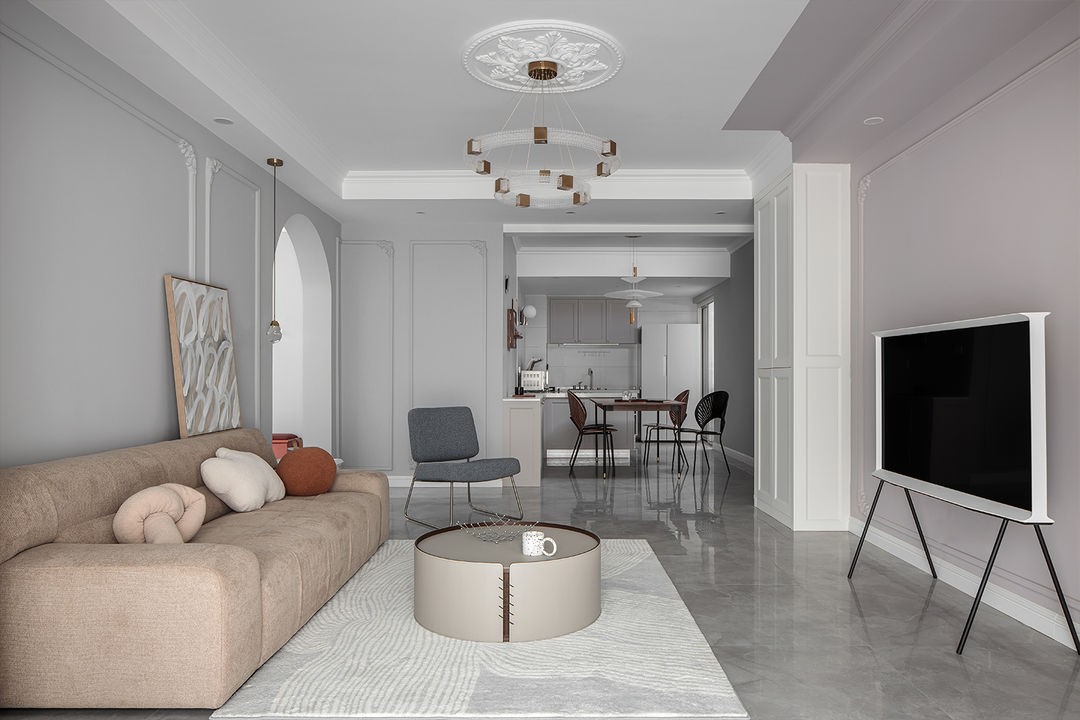 以法式为基底,通过流线的布局、线条的串联、低饱和的色彩、柔和的材质、为女孩打造一个浪漫而又充热爱的家。