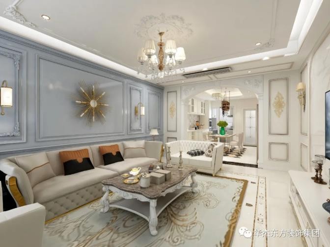 △ 沙发背景墙是以蓝调为基底,采用对称的手法以石膏线条做出显著的边框造型,并装饰以花纹、壁灯、金属饰品,整体格调优雅端庄而华丽。 地面围绕沙发区做了金色的拼花、波打线,与复古欧式宫廷风的地毯相得益彰。 沙发选用米色皮沙发配橙色调的抱枕,且家具亦是以对称手法布置,彼此呼应的细节让客厅显得更为别致。