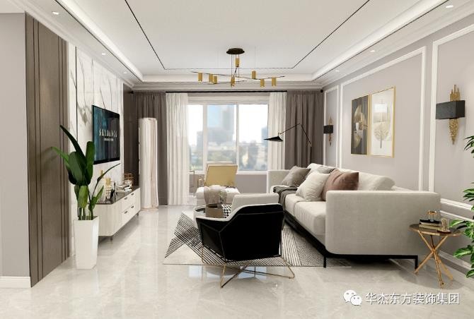 △ 客厅空间以浅灰色大理石质感的抛光砖为基础,天花吊顶四周筒灯+灯槽的组合,并在灯槽四周以及顶面加入一圈黑色线条,中间挂一盏枝型吊灯,显得简洁优雅而明亮大气。