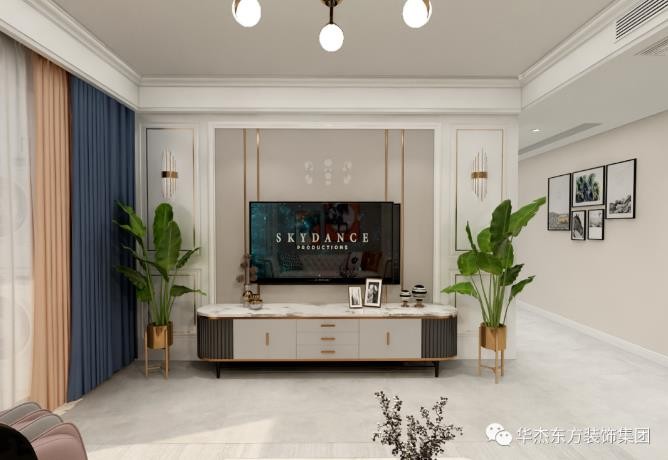 △ 电视背景墙为奶灰色硬包+白色护墙板,同时使用钛金线条装饰,壁挂电视机下方摆放边角圆弧的一字型电视柜,同样带有金属元素,造型简洁大方,尽显轻奢质感。