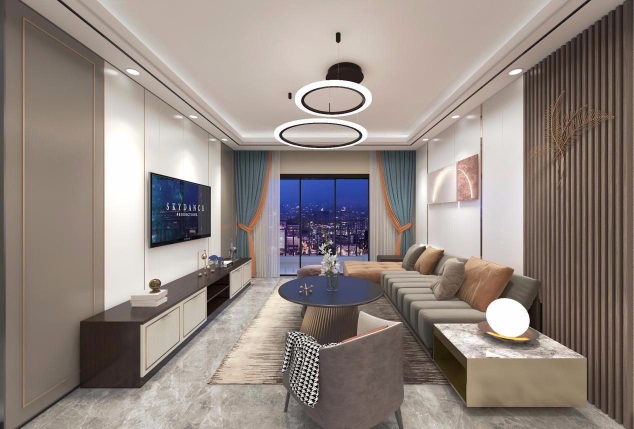 客厅|客厅电视背景与沙发背景墙选用了同系列样式的乳白面板,结合环状吊灯和筒灯,带出格栅的层次感,增添了高雅的气质。纯净的白色中带着暖咖色调,充满质感和轻奢气息却不显隆重。同时,用舒适的绒面沙发搭配质地清晰的圆茶几与柔和地毯,又中和了空间的刚硬,亲切而舒适。