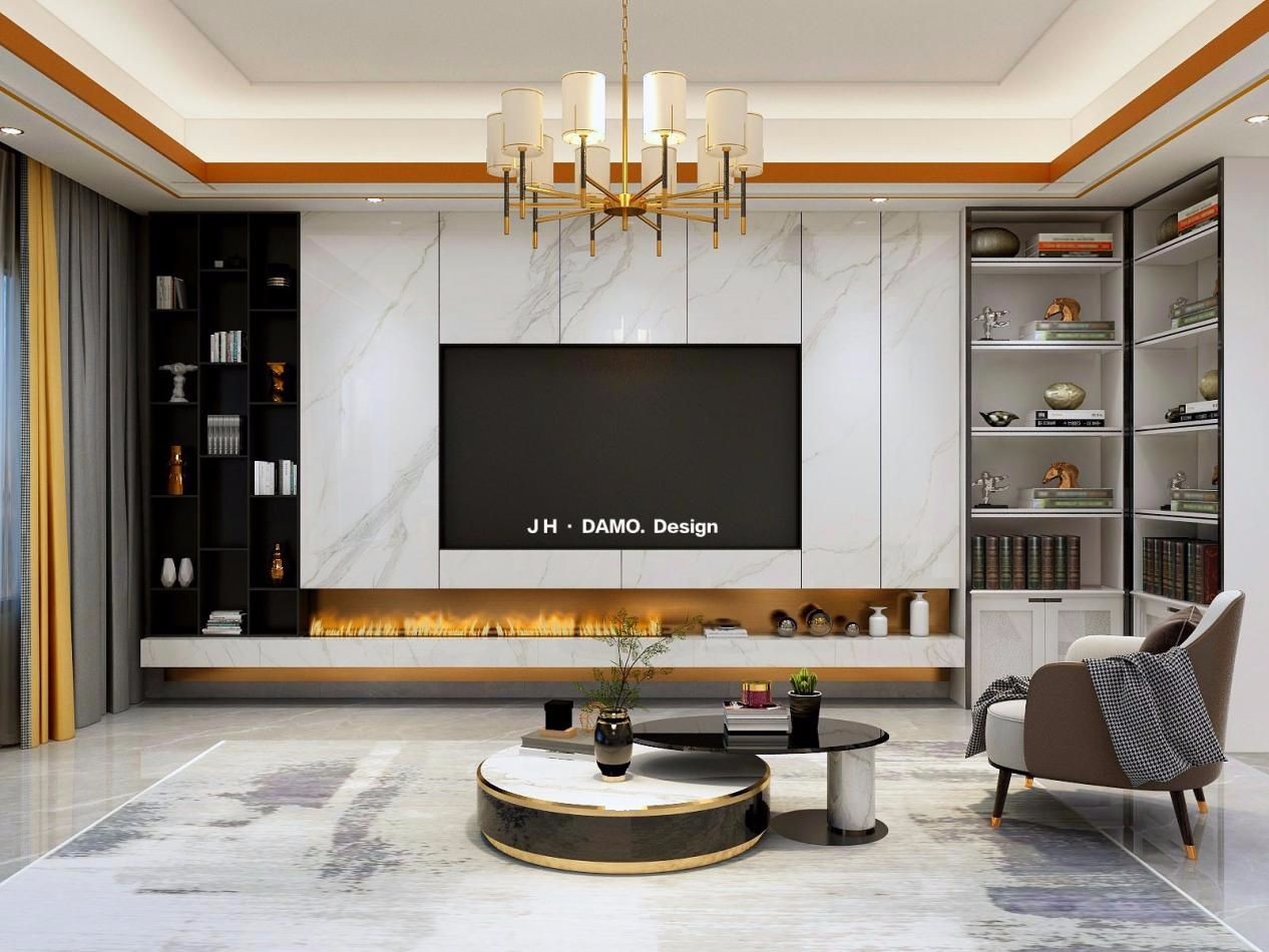 客厅|展示柜与大理石拼板的组合,让客厅集美观与实用性一体,摆放整齐的书籍,玲琅满目的饰品,突显主人优质的家居品味。空间简约而不简单,轻奢吊灯,柔和的暖黄灯光氛围下,层叠茶几时尚而个性,搭配舒适的棕白单椅、格纹毯,优雅而从容。
