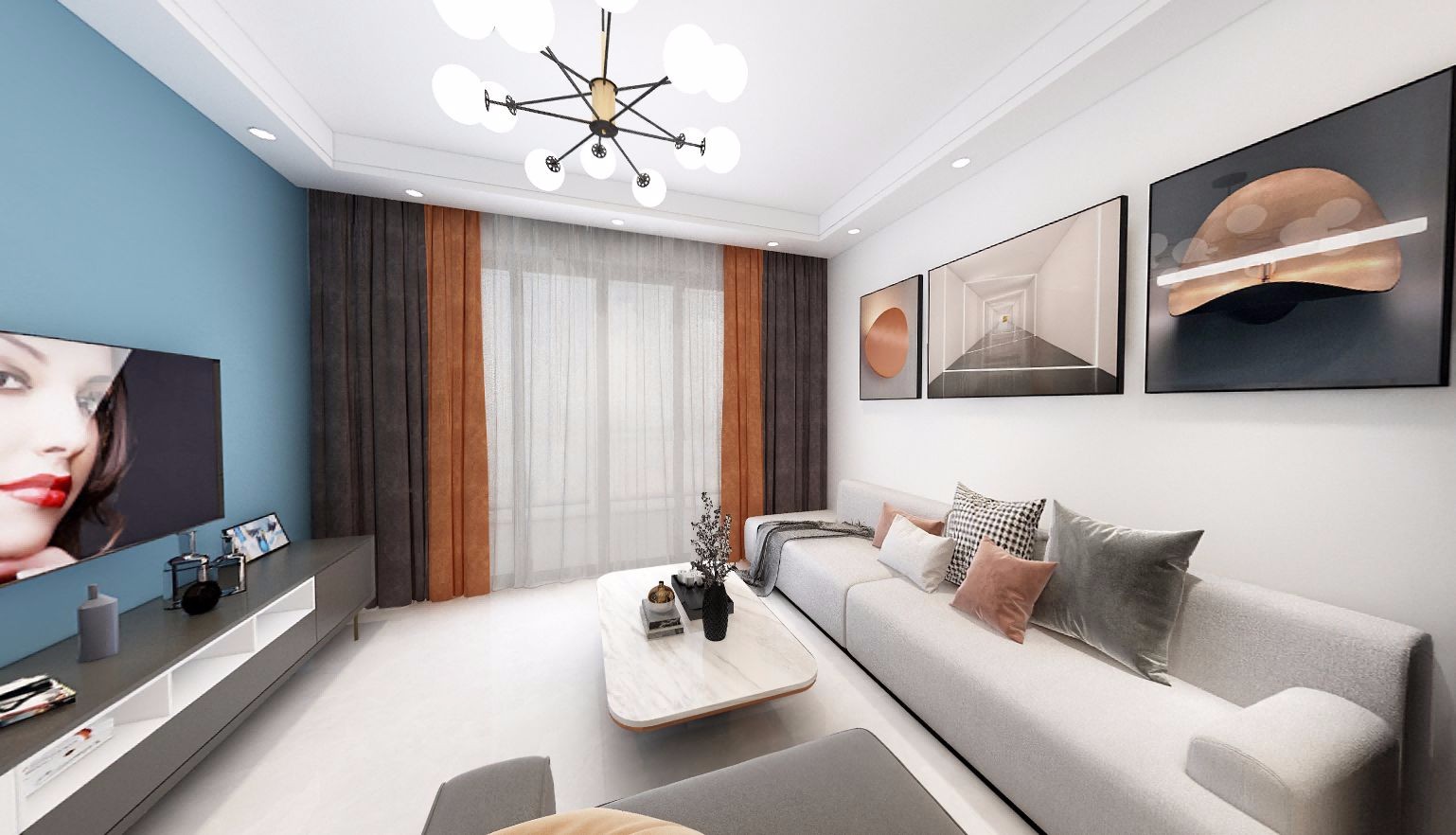 客厅作为一家人共享的休闲空间,在家具的选择上,一字型低靠背的米白色沙发,它完美满足家人对空间舒适的要求。天蓝色乳胶漆背景墙,天然纯粹质感,艺术美感的茶几,撞色印花窗帘,多种材质相碰撞,展现空间的视觉***感。