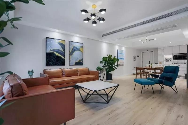 客厅餐厅中间的吊顶,刚好装下中央空间的室内机,同时也起着区分客餐厅空间的功能,地上摆一盆琴叶榕,让空间更加清新自然。