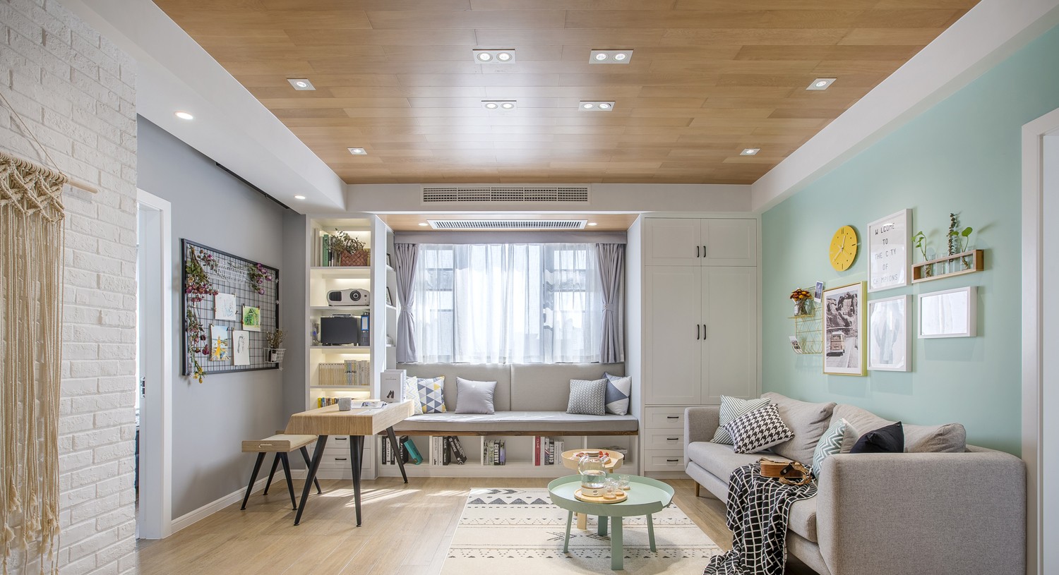 把靠窗的一面墙空间都利用起来,用作收纳柜和飘窗空间。