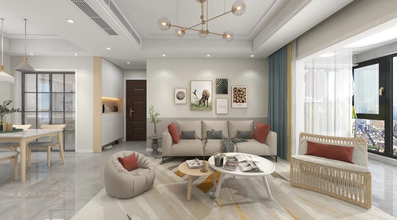 客厅的异形吊灯和相邻的餐厅吊灯极具现代感,白色与浅色家具搭配,简洁美观又实用
