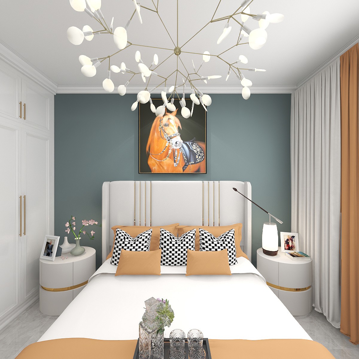 主卧床背景一个颜色搭配慢慢***感的爱马仕橙色,花少钱一样大气