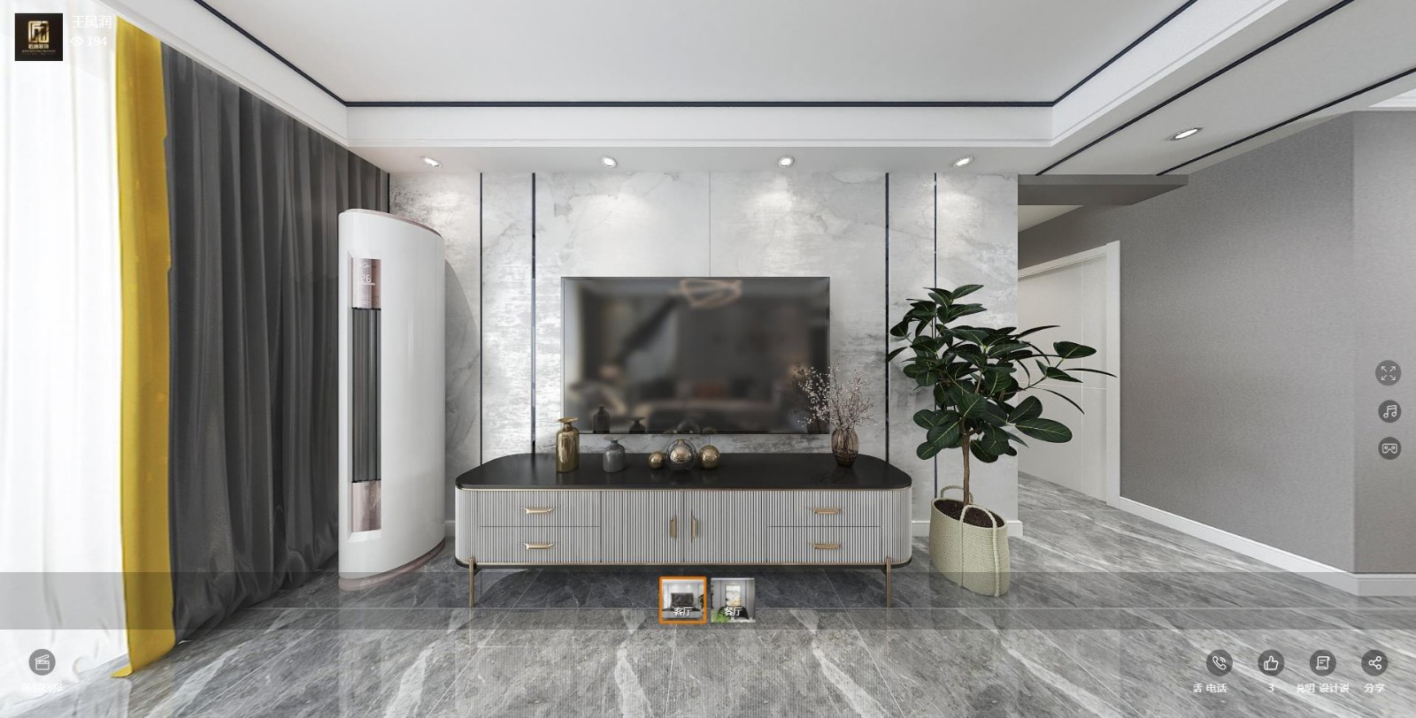 本案例在整体的黑白灰基调中点缀进黄色的窗帘,橘色的抱枕,金色的灯具和装饰画。用以提亮整个空间,使之活泼不沉闷。沙发墙用巨幅的抽象色块壁画做不对称设计,使空间有视觉亮点。