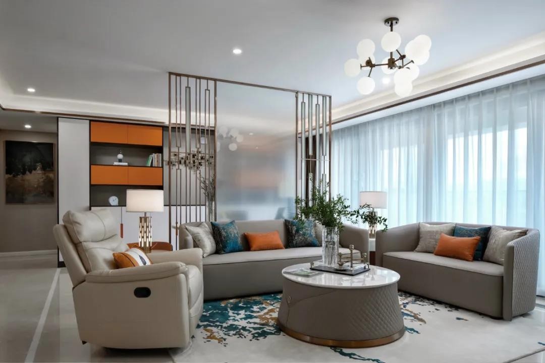 现代风的空间,在天花四周加入一圈的金属装饰线条,沙发不是靠墙的户型,在沙发后方装一个玻璃+金属屏风,灰色的地毯与沙发布置,加入蓝色与橙色的细节点缀,也显得更加华丽唯美。