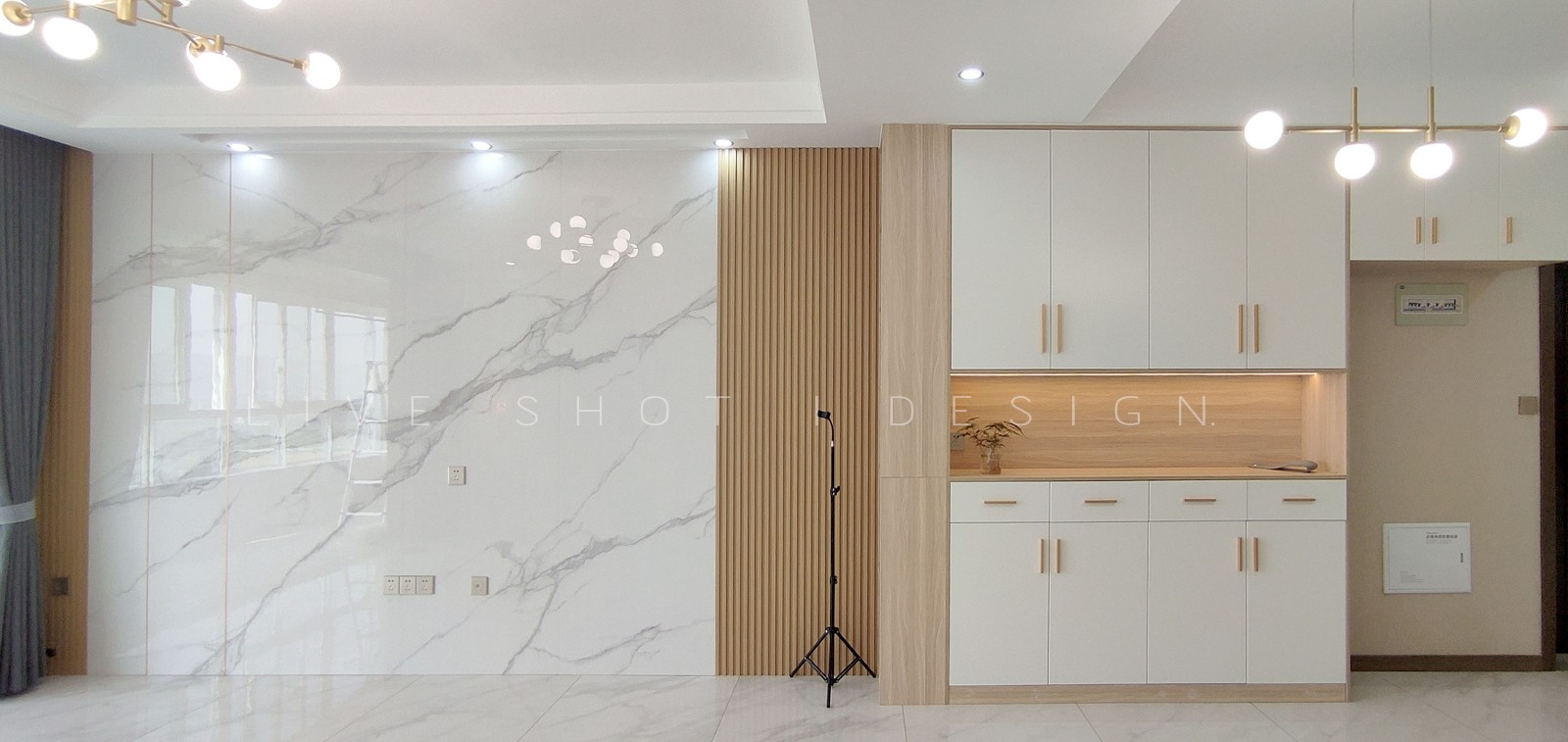 本户型属于三室两厅一厨两卫两阳台,客厅阳台相对于正常户型将近大一倍,虽然不是正常的南北通透户型,但是采光足够。本设计方案风格属于极简轻奢,我们的业主由于对生活有品质上的追求,整体没有过多的装饰,原木色为辅助色,金色为点缀,线条感虚实结合,满满质感细节。