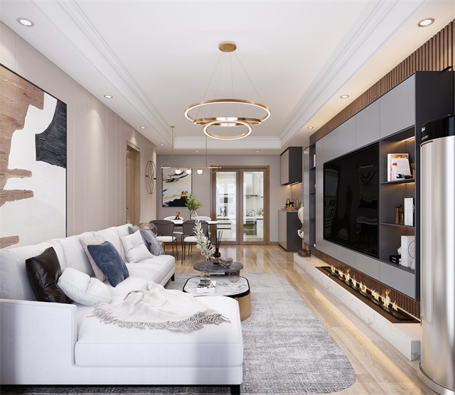 现代的风格主要通过集成墙板和具有现代感的整体电视柜来体现,结合金属色调的灯具,使空间不那么冷,有家的温暖。