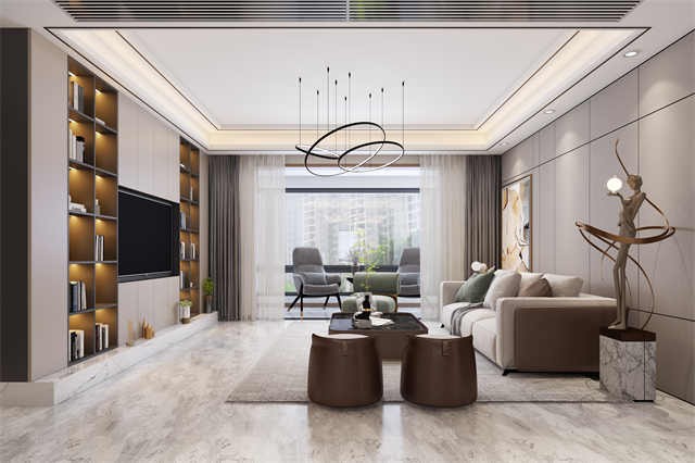 客厅明亮宽敞,这里需要一提的是,做了一个隐形门背景墙,将儿子的房间隐藏在客厅沙发背景之后,十分巧妙,统一的前提下,又做了材质和颜色的区分。