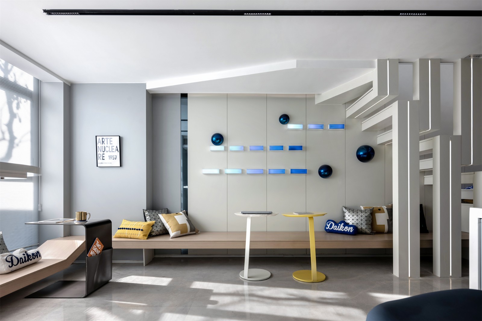 在首层办公区布局时,设计打破传统办公室和办公桌的方式,创造了团队内协作活动的多样化工作模式。 一层作为团队成员的联合办公空间,通过卡座区与吧台区两种不同场景的划分,同时满足办公、聚会、休闲功能。 开放式的半围合空间,没有边界的分割促进交流,提供了更有益于创意发生的高效工作场所。 二层被划分为企业管理者的独立办公空间,且兼具办公、休闲、样板拍摄与品牌资料室。