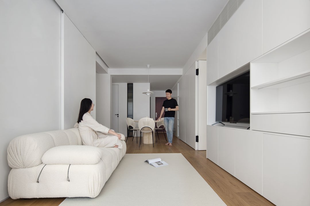 餐边柜、卧室隐形门和电视柜衔接非常到位,无明装门把手设计,确保了视觉连贯性和整洁性。