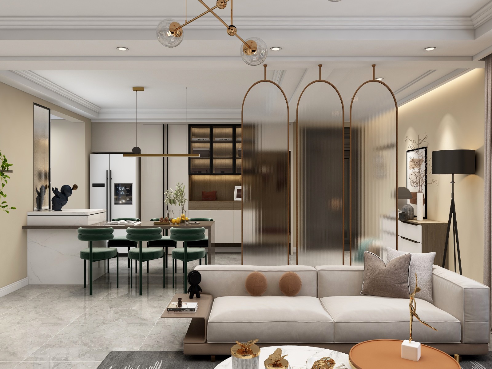 本案为现代轻奢风格,整体采用了暖色系,简洁造型、无过多的装饰,由于线条简单、装饰元素少,所以需要软装及家具的完美配合,例如沙发和靠垫、窗帘、茶几、电视柜、灯具以及装饰画等。开放式的厨房与定制的倒台餐桌融为一体,使居室的空间布局与使用功能完美结合。主卧室同样采用暖色调,白色系的床头背景墙可以完美替代厚重的床头,增加了整个空间的舒适感与设计感。
