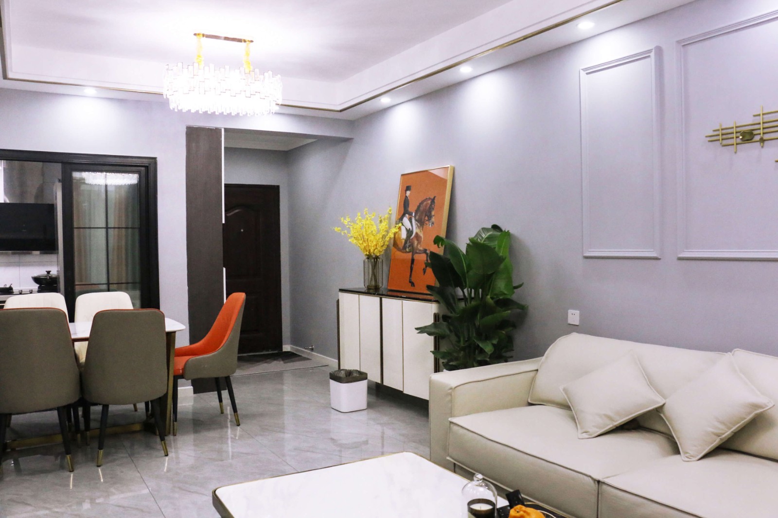 ①拆除阳台两侧墙体,纳入客厅区域,使其公共空间更为宽敞; ②原始厨房内侧动线混乱,拆除多余墙体,优化生活动线; ③厨房外侧与餐厅区域相连墙体拆除,改为玻璃门,将充沛的自然光线引进正对的暗厨。