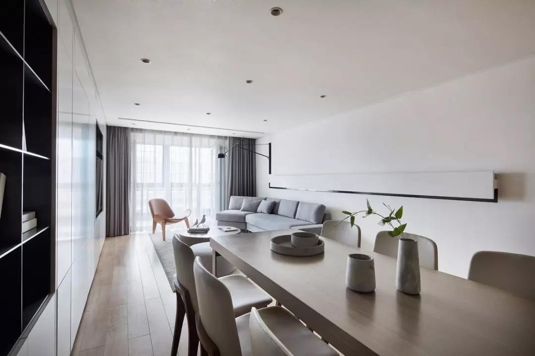 进门是餐厅、厨房和客厅区域,无吊顶式的设计给房间增加了采光和层高。不规则的射灯为居室赋予灵动的美感。餐厅的侧边也做了嵌入式的书架,既节约空间,又有美化作用,黑色书架搭配白色立柜,经典大方、尽显时尚感。